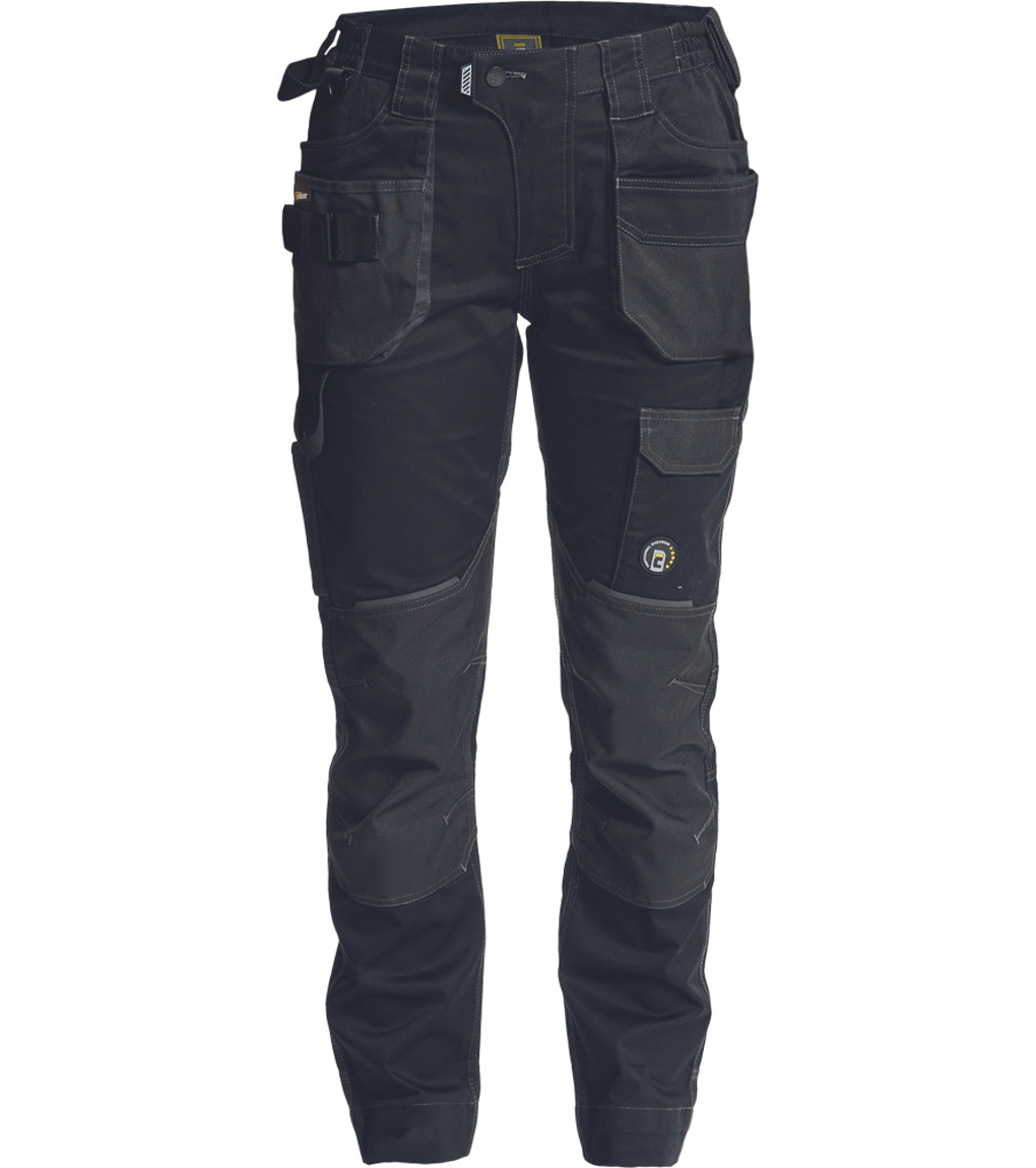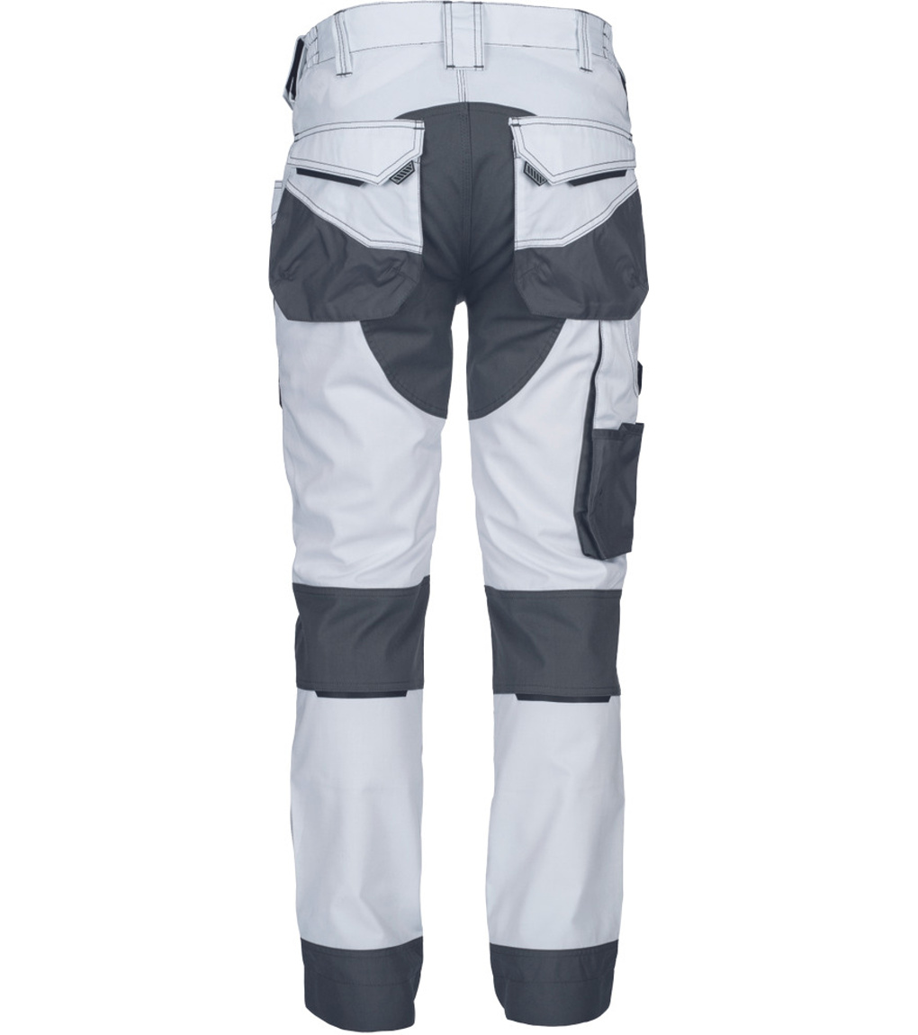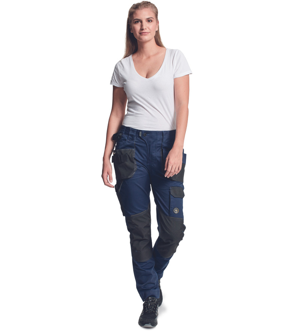 Dámské pracovní kalhoty s pružným pasem. Elastický inovativní materiál TRIFIBETEX®. Odolné trojité prošití nohavic a sedu. Oxford 600D zesílení v oblasti kolen s možností vkládání kolenních výztuh. Prostorné multifunkční přední kapsy s poutky na nářadí. Reflexní prvky v barevném odstínu. Nastavitelná délka nohavic.