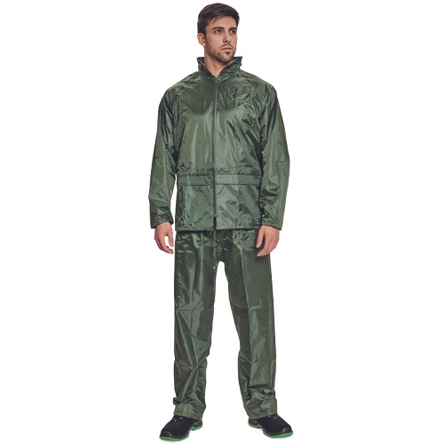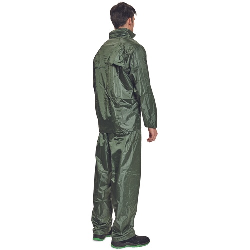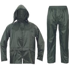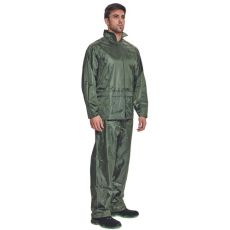 Dvoudílný voděodolný oblek s kapucí. ¾ plášť s integrovanou kapucí v límci a kalhoty v pase do gumy. Dvě přední široké kapsy kryté légami proti průniku vody. Spodní část rukávů lze regulovat drukem. Ventilace na zádech a v podpaží. Transportní obal.