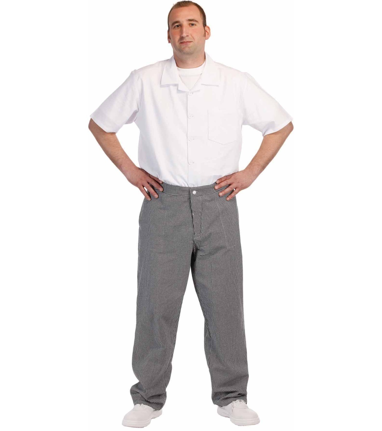 Pánské bavlněné řeznické kalhoty. Polohovatelný pas na knoflíky. 2 přední klínové kapsy, 1 zadní kapsa.