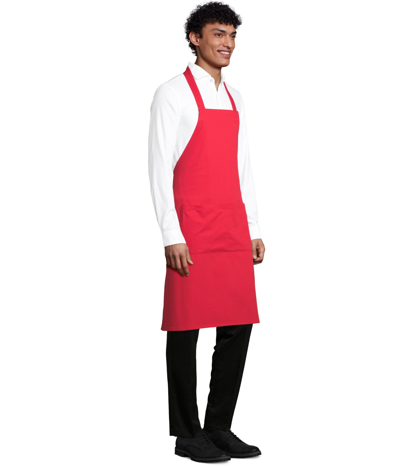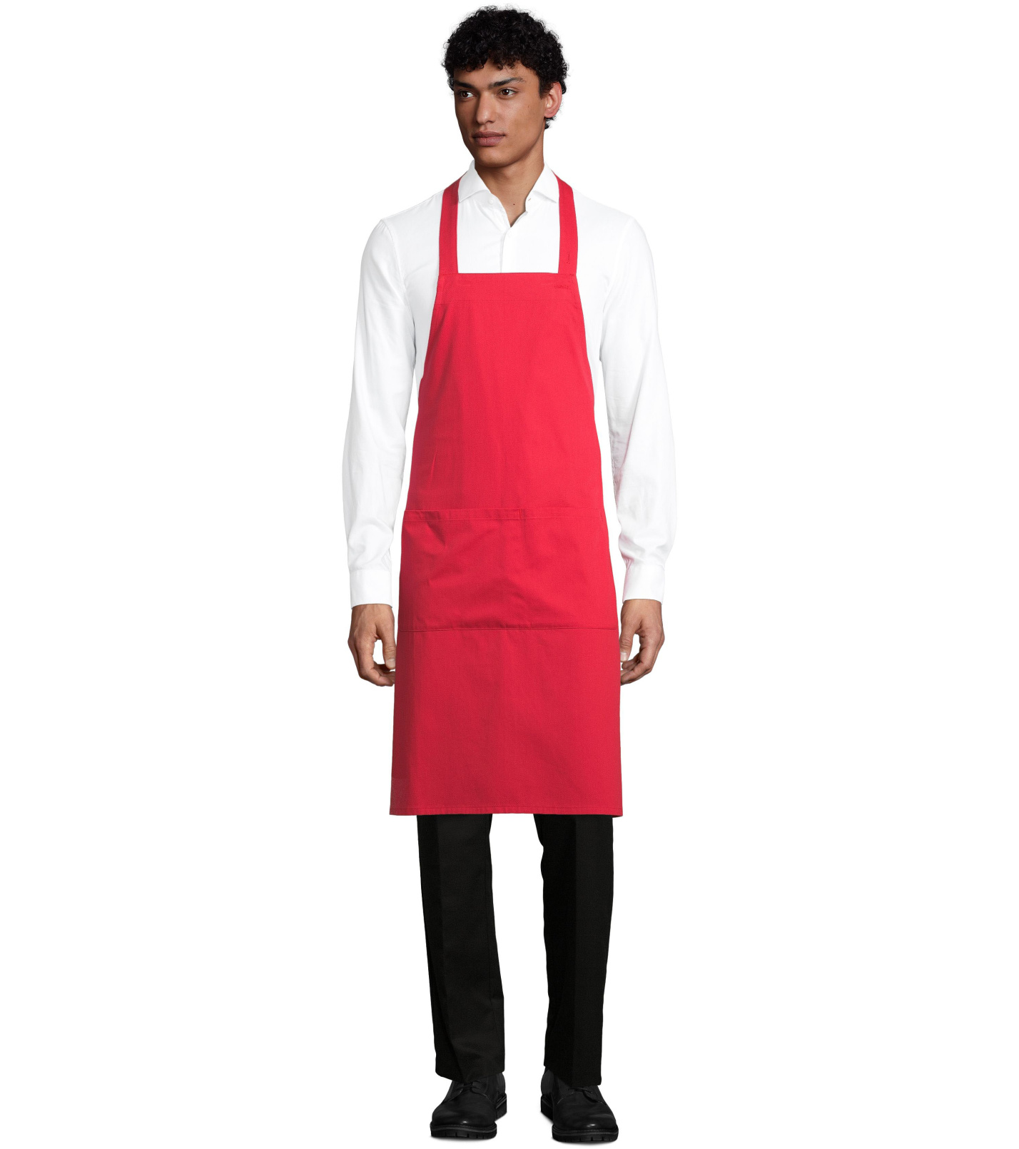 Dlouhá zástěra z ekologicky pěstované bavlny. Velká přední kapsa se dvěma přihrádkami. Na zavázání kolem pasu.