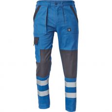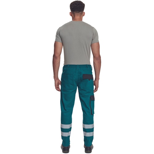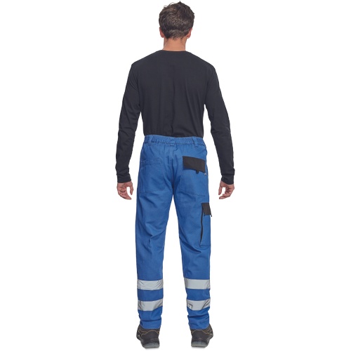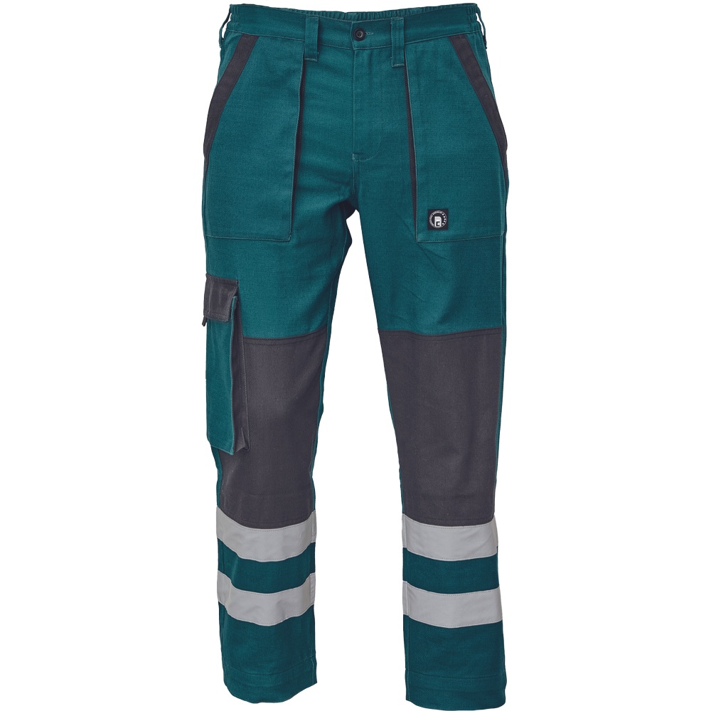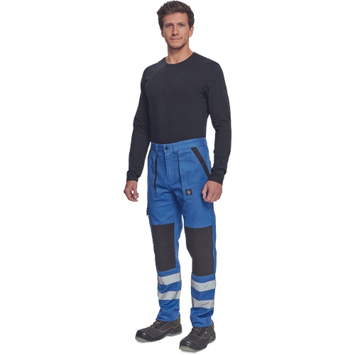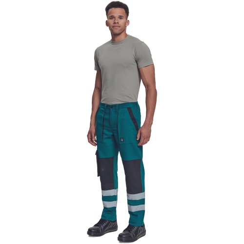 Pánské pracovní kalhoty s elastickým pasem. 2 přední kapsy, 1 stehenní kapsa, 2 zadní kapsy. Reflexní pruhy na spodní části nohavic. Zesílená oblast kolen. Nastavitelná délka nohavic.