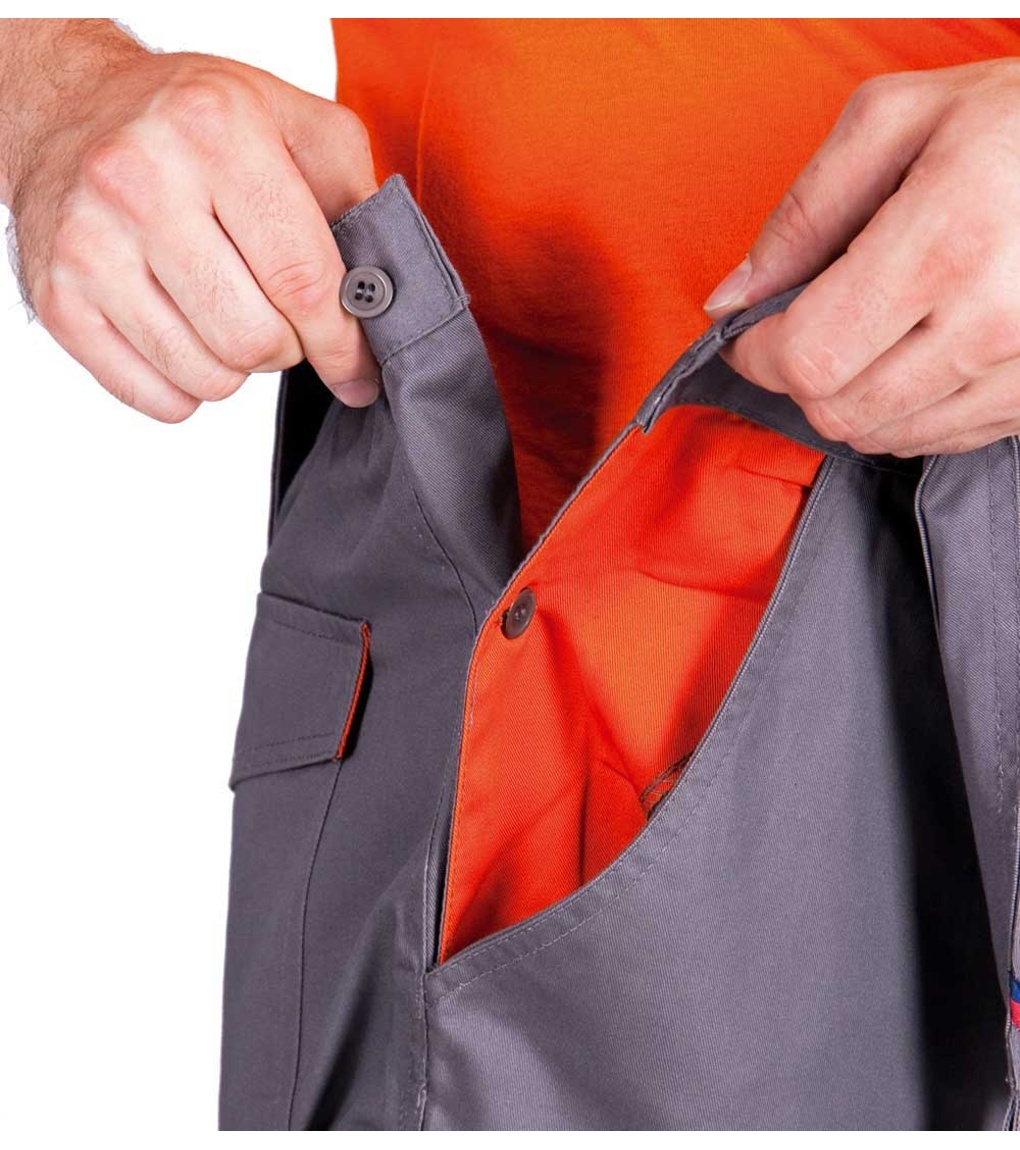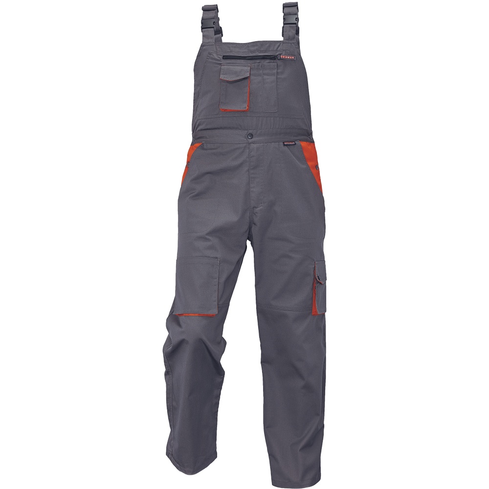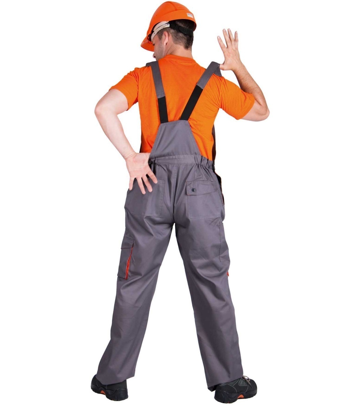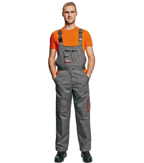 Pracovní kalhoty s laclem pohodlného střihu. V pase na gumu a zapínání na knoflíky. 7 funkčních kapes. Široké elastické šle.
