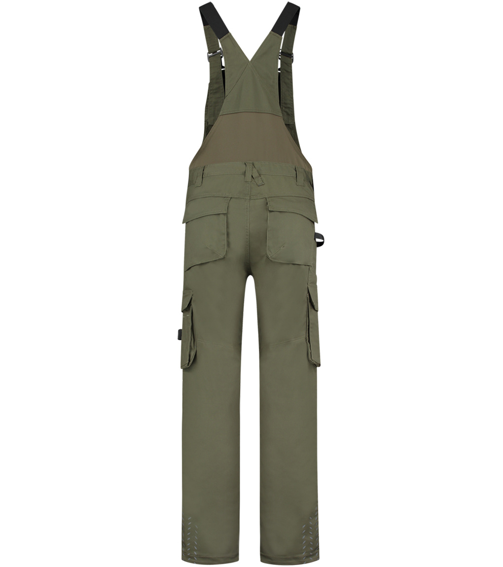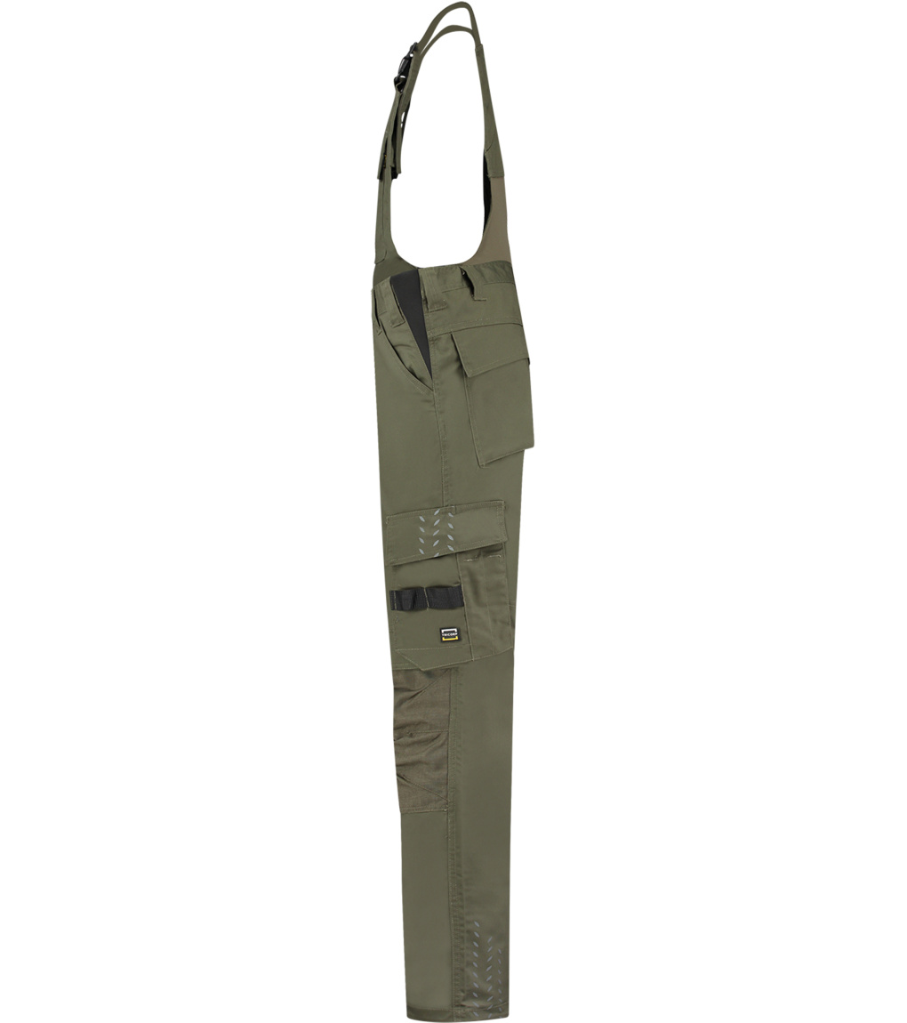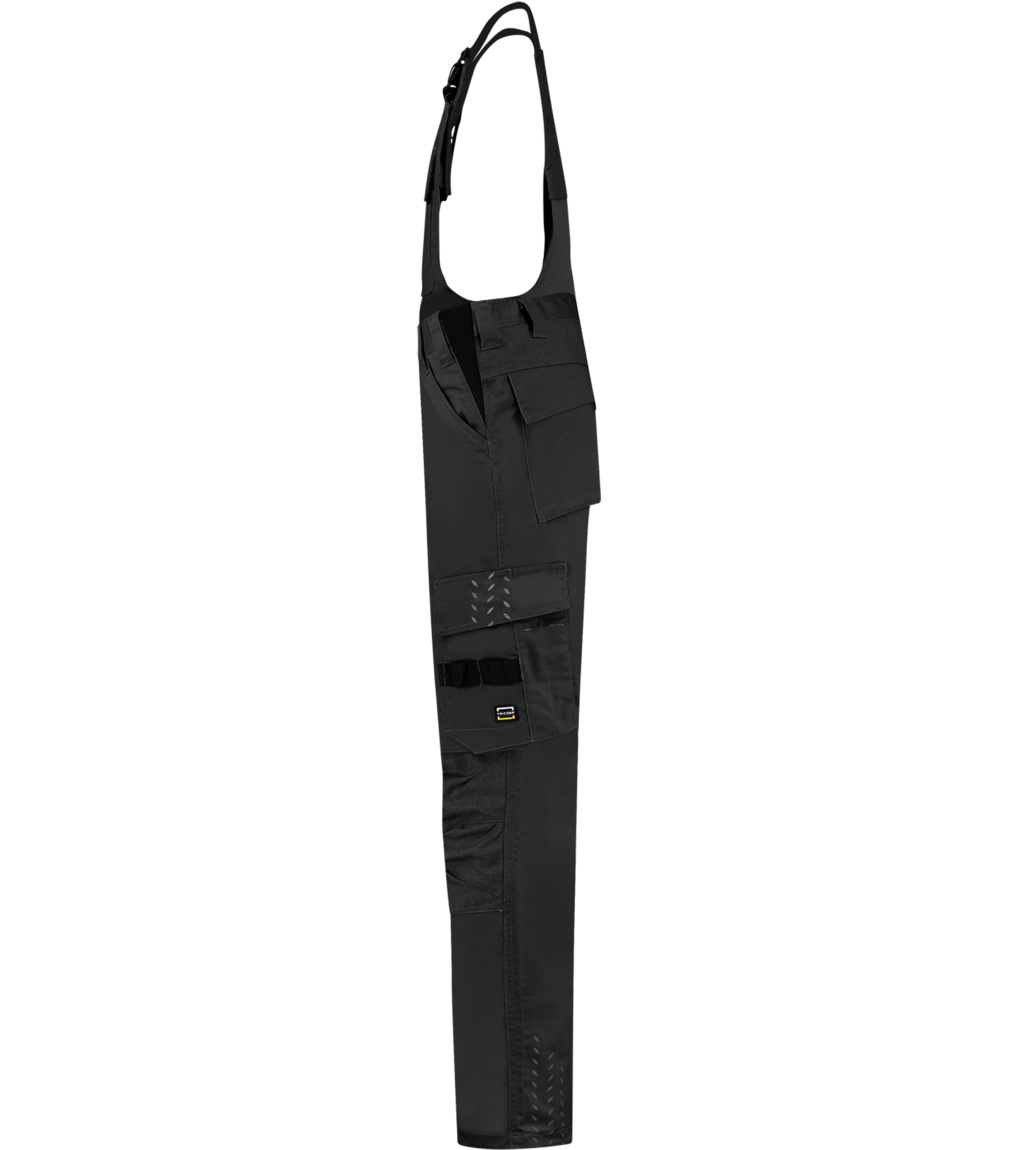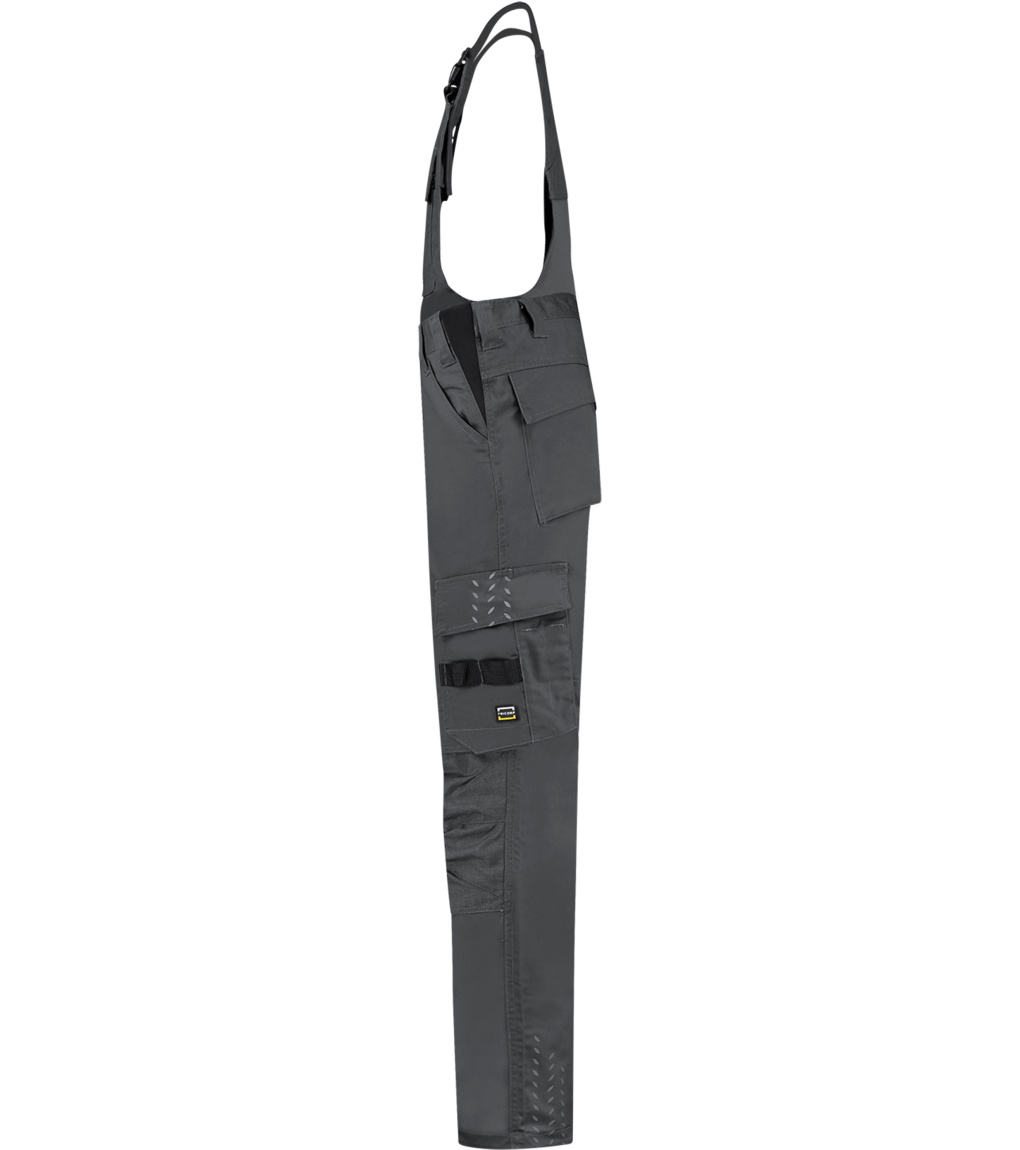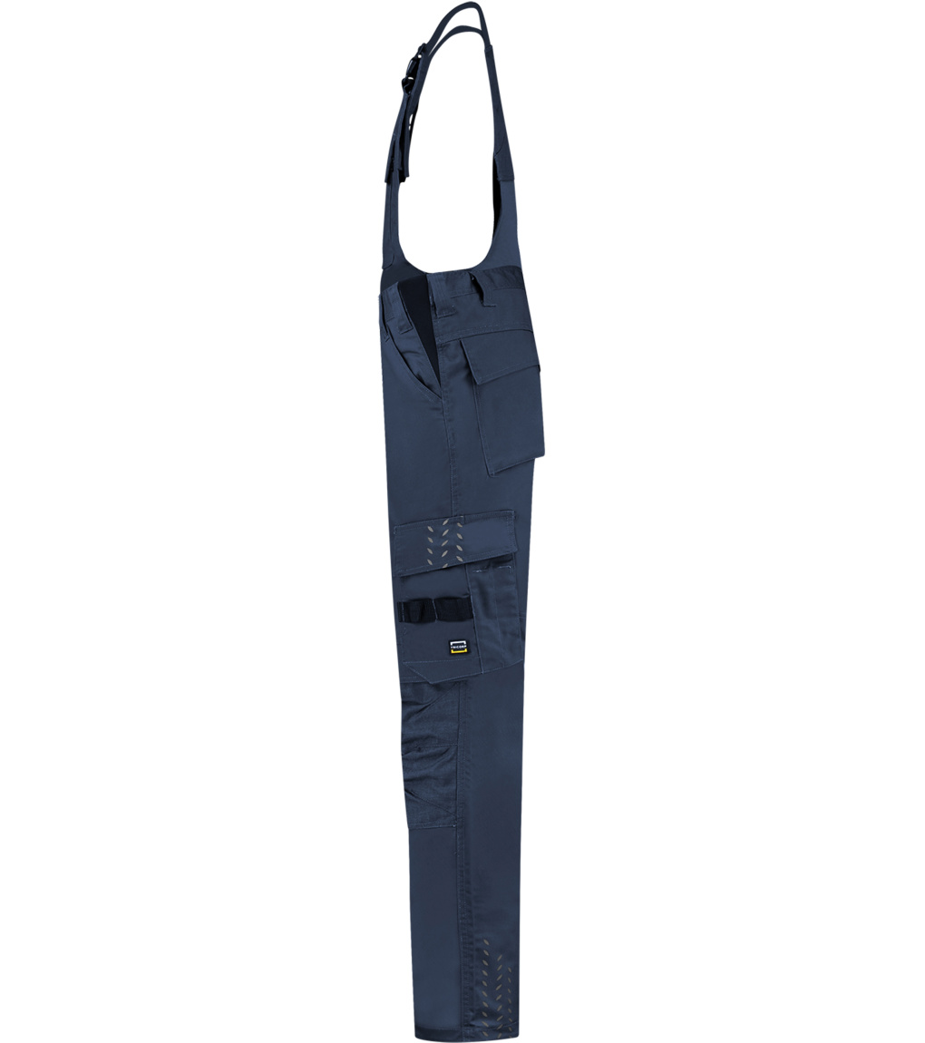 Uni pracovní kalhoty s laclem. Pruženka v boční části pasového límce, šle s elastickým dílem nastavitelné přezkou, multifunkční kapsy a CORDURA® v oblasti kolen pro pohodlné nošení. Reflexní prvky pro zvýšení bezpečnosti. Zvětšení švové záložky pro možnost individuálního prodloužení o max 6 cm.