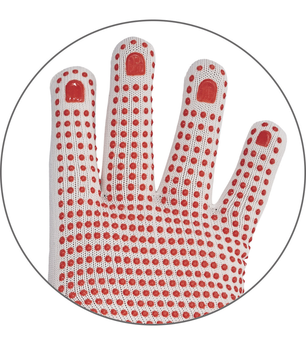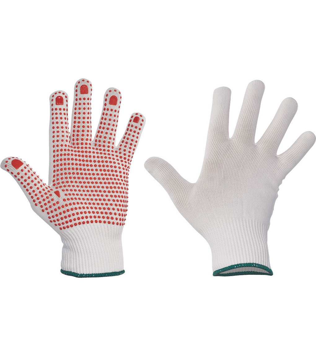 Pletené bezešvé nylonové rukavice s PVC terčíky v dlani a na prstech a pružným úpletem na zápěstí.