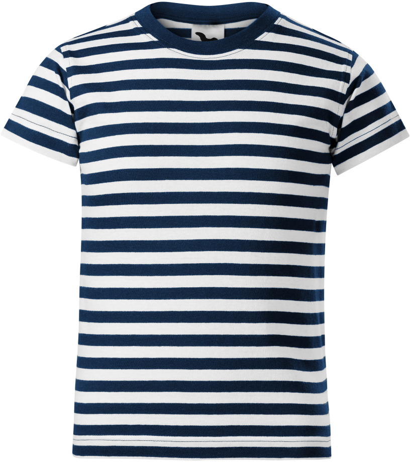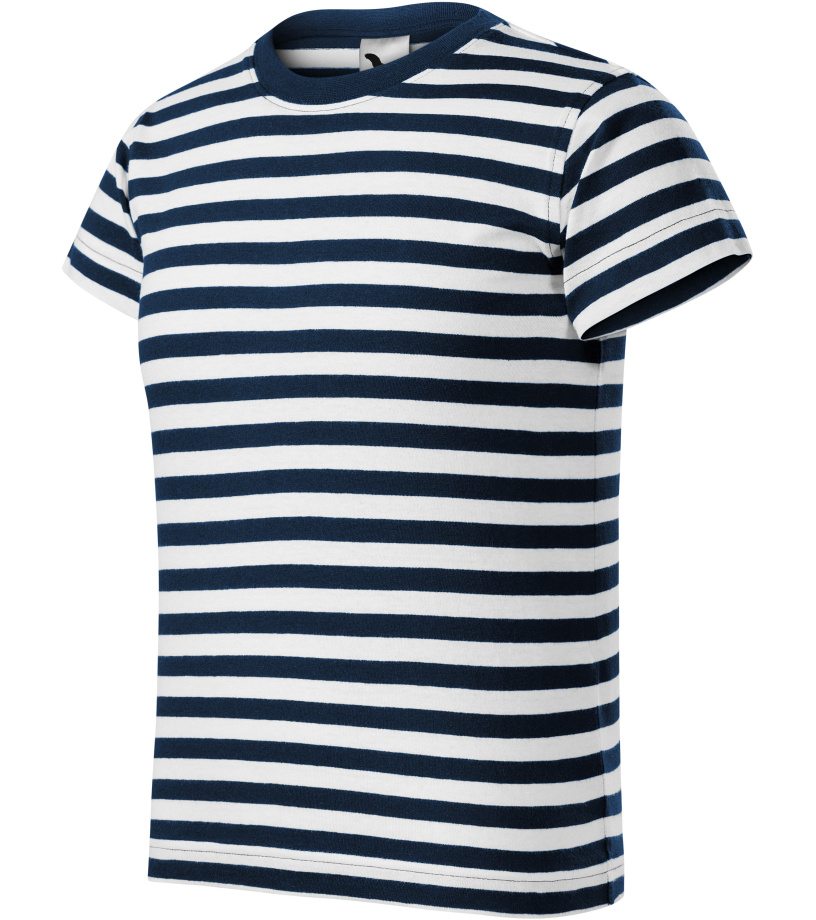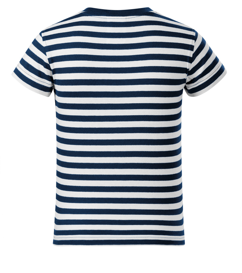 Pánské tričko s pruhy v kombinaci bílá a námořní modrá, střih s bočními švy, úzký lem průkrčníku z žebrového úpletu 1:1 s 5 % elastanu, vnitřní část průkrčníku začištěna páskou z vrchového materiálu, zpevnění ramenních švů páskou.