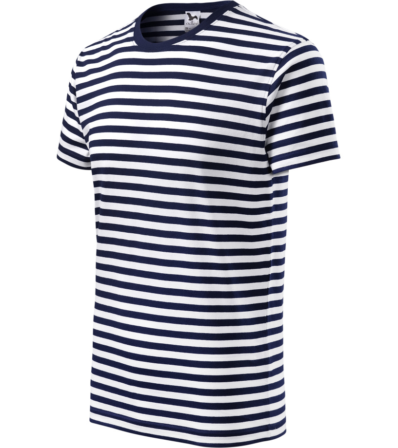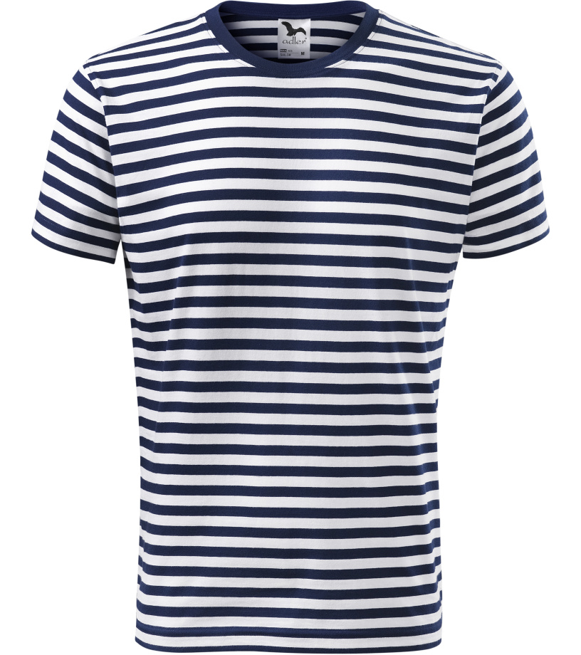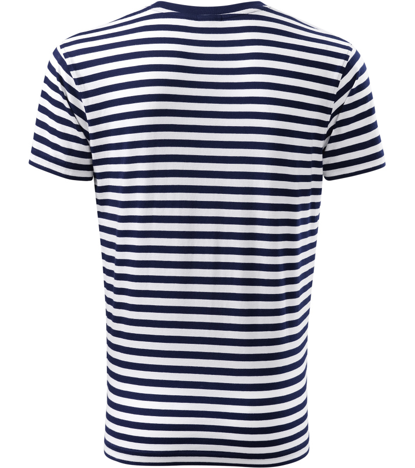 Kvalitní pánské tričko střihu s bočními švy a pruhy v kombinaci bílá a námořní modrá vhodné pro tisk a výšivky má úzký lem průkrčníku z žebrového úpletu 1:1 s 5 % elastanu, vnitřní část průkrčníku začištěnu páskou z vrchového materiálu a zpevnění ramenních švů páskou.